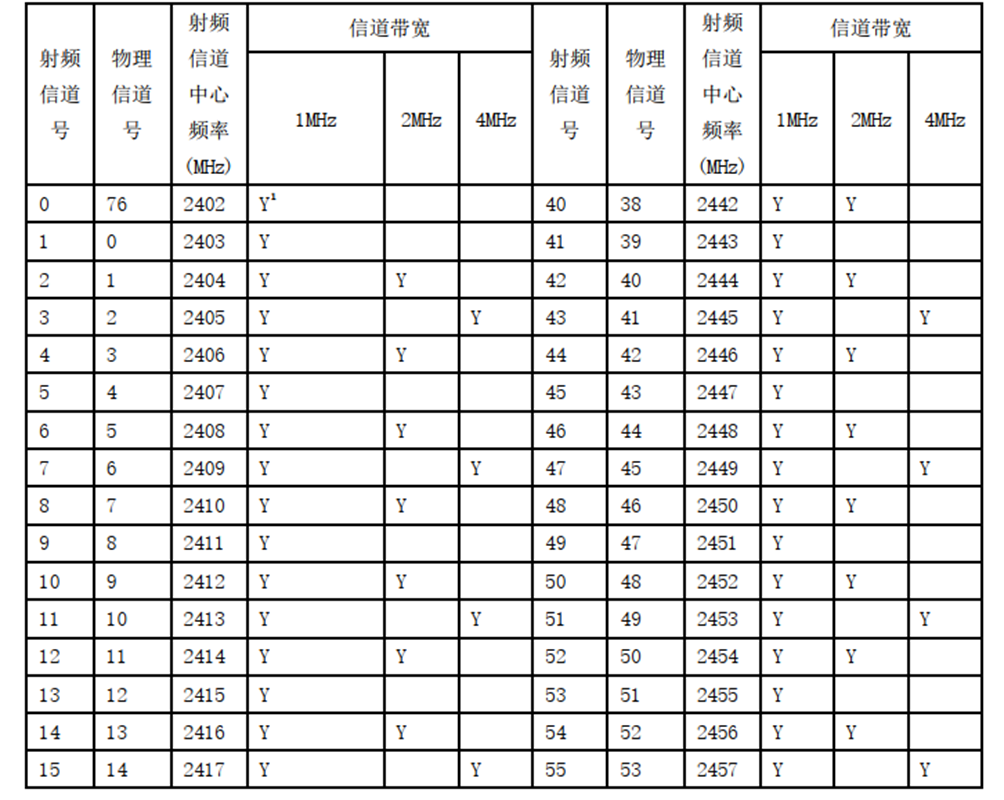 图 1 2400MHz频段不同带宽信道对应的射频信道中心频率和射频信道号1