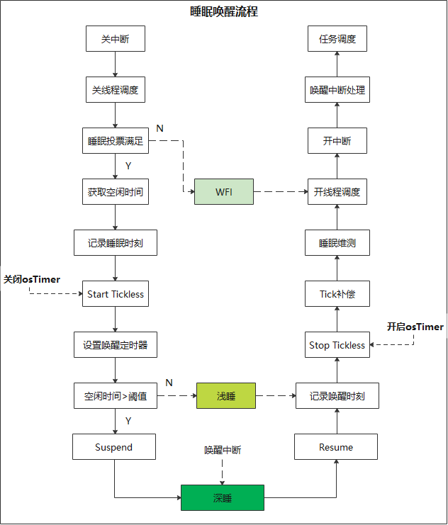 系统空闲时间由LiteOS管理,在睡眠投票满足时,睡眠管理接口中会判断睡眠时间是否满足深睡阈值,满足即进到深睡流程。低功耗管理接口会根据系统空闲时间添加唤醒计时器,保证系统能在预期时间点醒来。