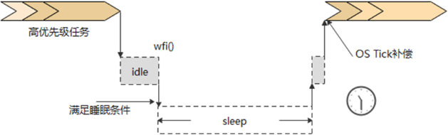 低功耗的本质是指从功耗的角度对电子设备的设计进行优化,以达到在满足功能需求的同时,尽可能降低功耗的目的。通常涉及到对硬件设计、软件优化、材料选择等方面的深入研究和优化。对软件设计而言,可以通过系统空闲时CPU停止工作,中断或事件唤醒后继续工作等方法来优化功耗。对于无OS运行的系统而言,程序可以“随时随地”进低功耗;但是对于带OS的系统,系统无法“随时随地”,必须遵循OS的运行流程。