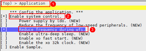 CPU空闲时系统进入WFI状态,为进一步降低该状态下的功耗,可以打开宏 CONFIG_REDUCE_FREQ_DURING_WFI,降低该状态时的CPU和总线频率,以及临时关闭flash时钟,配置如下: