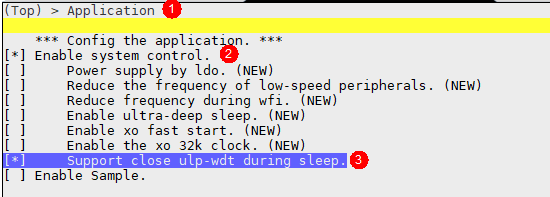 系统睡眠时uapi_watchdog下电,ulp_wdt不下电。深睡场景,为了防止狗超时,系统需要唤醒去喂狗,对于长时间不工作场景,每次让系统醒来专门去喂狗,既增加功耗也显得不太必要,所以用户可以打开宏 CONFIG_SUPPORT_CLOSE_ULP_WDT_DURING_SLP 控制系统在休眠时关闭ulp_wdt,如下:
