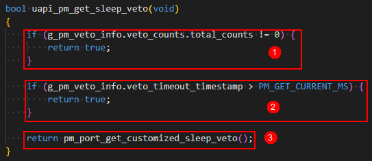 分析:客制化睡眠投票接口(pm_port_get_customized_sleep_veto)有判断UART TX是否有数据,如果TX还有数据,则投否决票。