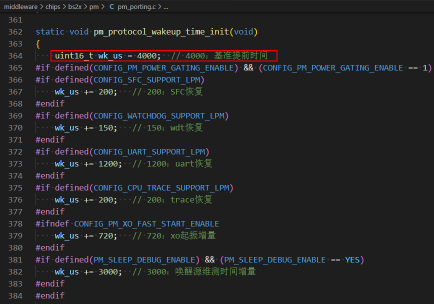 如果在某些软件版本中由于一些链接脚本修改导致软件处理变慢,下面这个时间可能不够,会出现蓝牙丢业务中断进而导致睡眠唤醒异常。如果不带蓝牙业务时睡眠正常,带蓝牙业务时也已正常调大interval/latency,系统无法睡眠,并且蓝牙业务异常,大概率是此时间不够,需要适当增加以解决该问题。