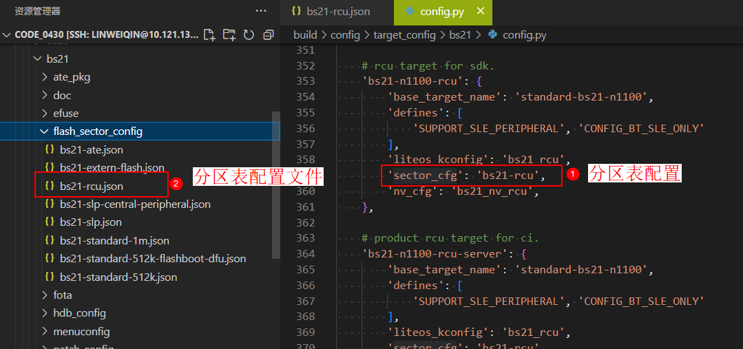 在BS2X中,客户可根据需要划分Flash分区。在版本的sector_cfg选项中修改相应的分区,分区表的路径位于build/config/target_config/bs21/flash_sector_config。如图1。