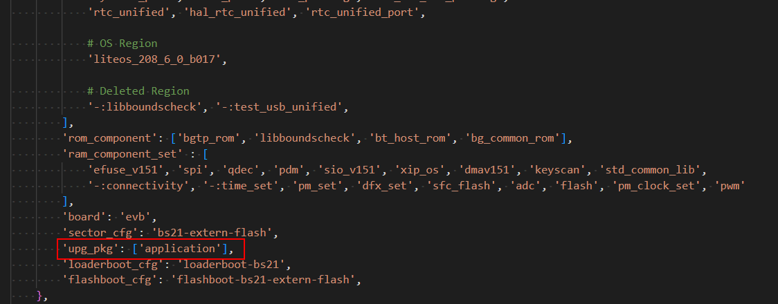 BS2X在编译生成新固件时,会自动将生成固件打包成升级包,用户只需选择需要升级的固件。配置升级固件的文件路径:build/config/target_config/bs21/config.py。如图1所示,在upg_pkg选项中选择需要升级的固件,支持升级的固件:flashboot,application。