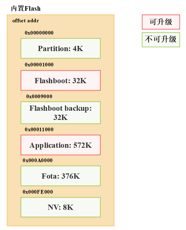 在BS2X中,升级包保存在Flash中,包括内置Flash以及外挂Flash,用户可根据产品的需求选择不同方案。Flash的内存分布如下(内置Flash基地址:0x90100000)。