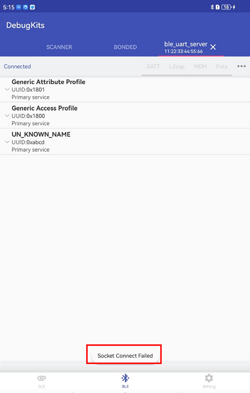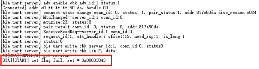 可以先打开OTA业务的Log开关,如图1。排查一下版本是否注册OTA业务,DFX是否注册OTA通道,具体参考“BLE传输”、“星闪传输”。例如DFX未注册OTA通道时,Client端(手机apk或星闪Dongle)读取对端版本号会失败,如图2所示。若是OTA业务未注册,升级界面无法进入,如图3所示。