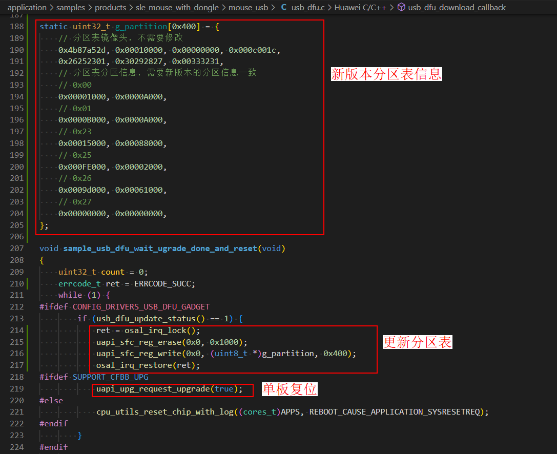 在升级的传输流程结束后、单板复位前,修改旧版本分区表其他区域区,使分区表与新版本分区表保持一致。DFU升级的代码修改如图7,OTA升级的代码修改如图8。