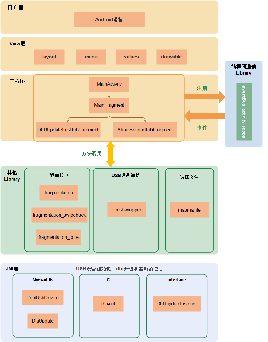 DFU升级APK的系统框架如图1所示,主要分为View层、主程序和多个library。