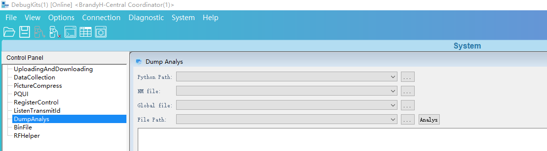 在DebugKits工具的System界面选取DumpAnalys选项,在对应的选项上选取相应的路径;如图1所示(注:也可以将编译后的parse_tool文件夹,application.nm文件及last dump内存导出文件拷贝到本地PC上进行处理,工具选取对应路径即可)。