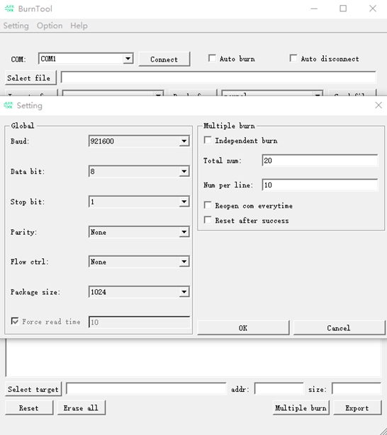 Force Read Time:定时读取的时间,以毫秒为单位。勾选时为定时读取串口,不勾选时为事件触发读取串口。适用于不勾选该选项无法正常烧录的场景。图 3 串口设置示例