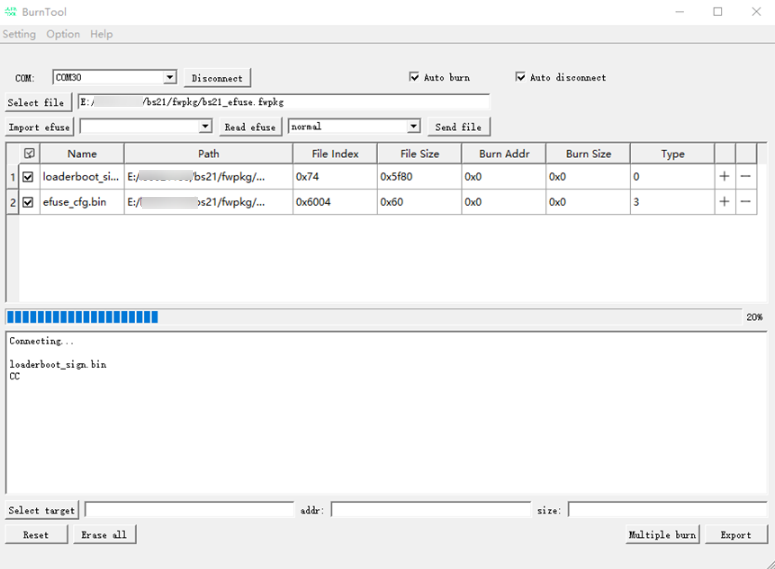 在BurnTool界面中,单击“COM”按钮选择PC机串口(串口选择,请参考开发板使用指南);单击“Select file”按钮,选择各产品编译生成的固件包,并单击“OK”,如图2所示。efuse_cfg.bin为待烧录数据,烧录类型为3。