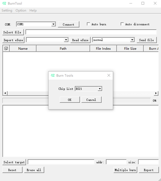 在BurnTool界面中,单击“Option”按钮,选择“Change chip”,从“Chip List”下拉菜单中选择“BS21”,并单击“OK”即可,如图1所示。