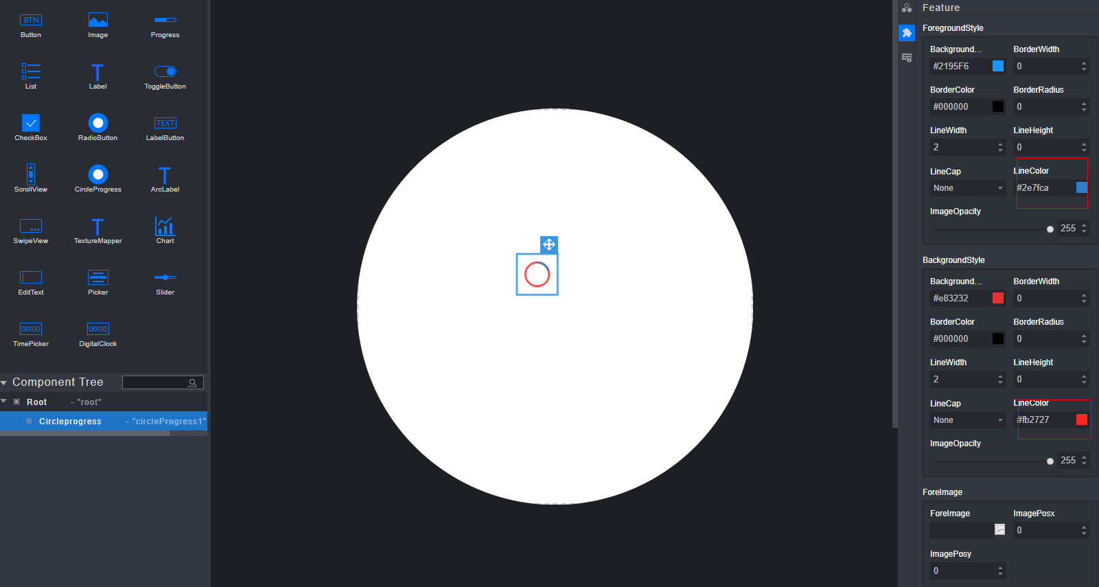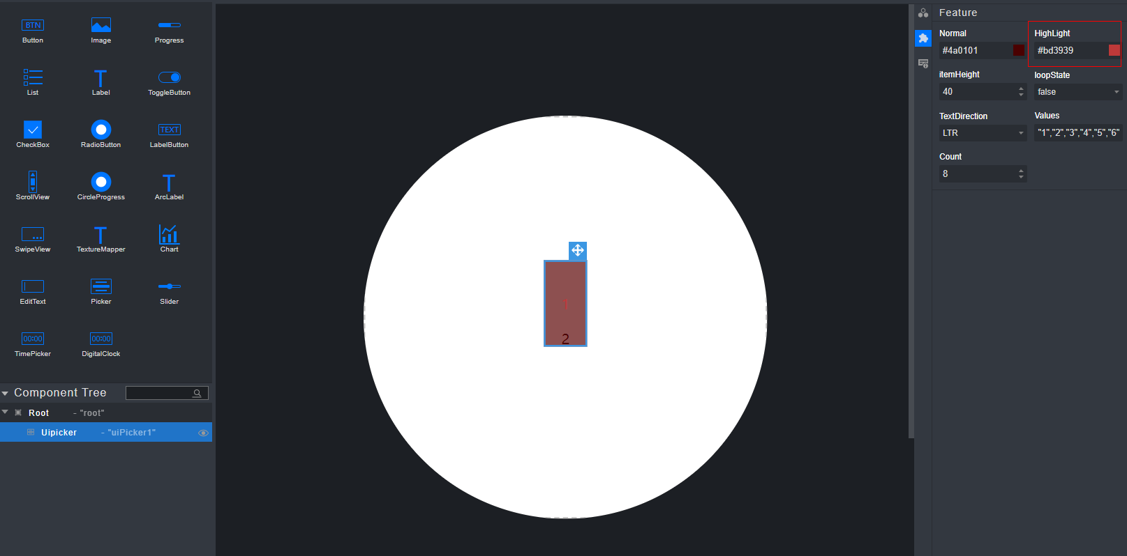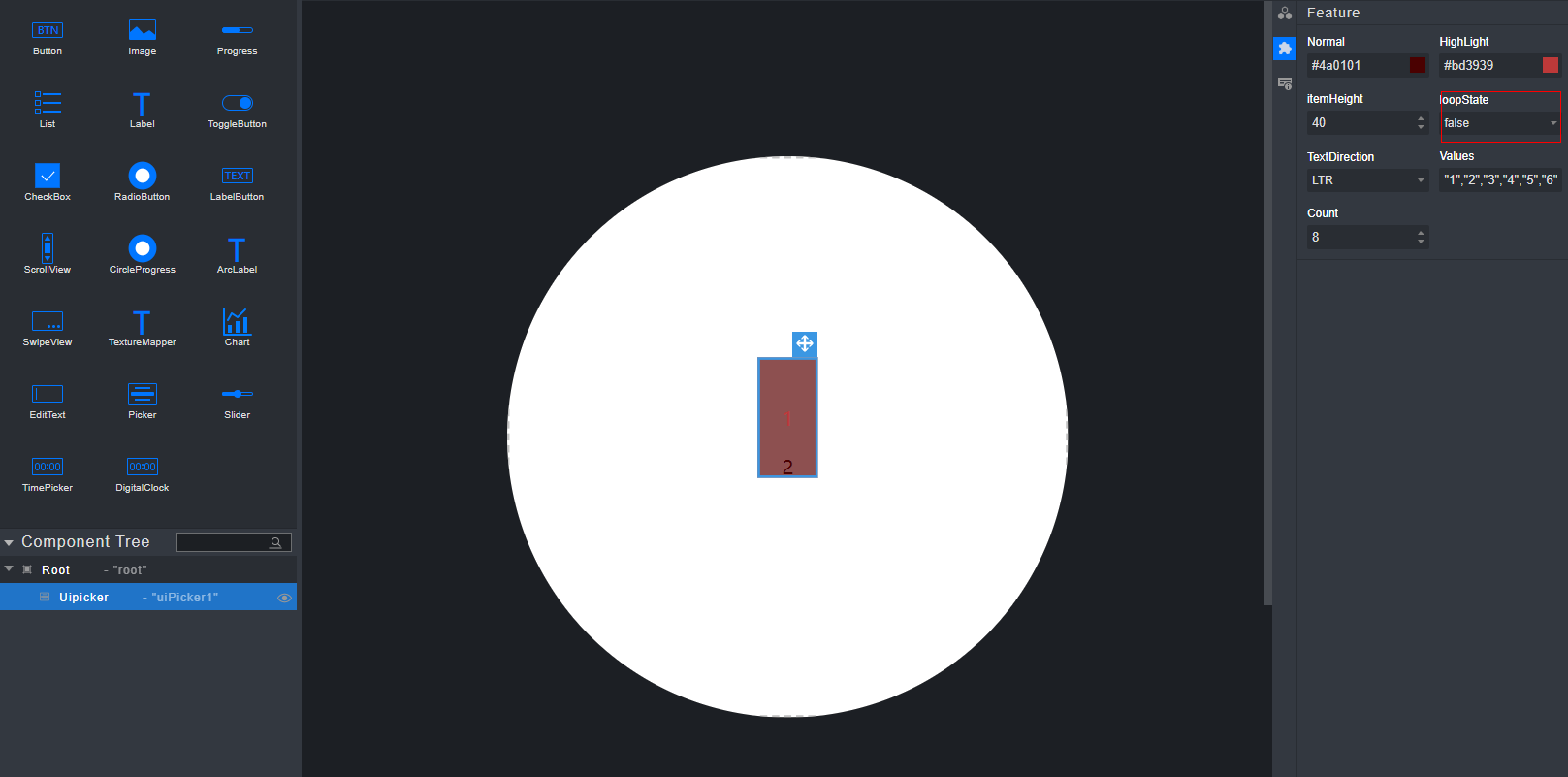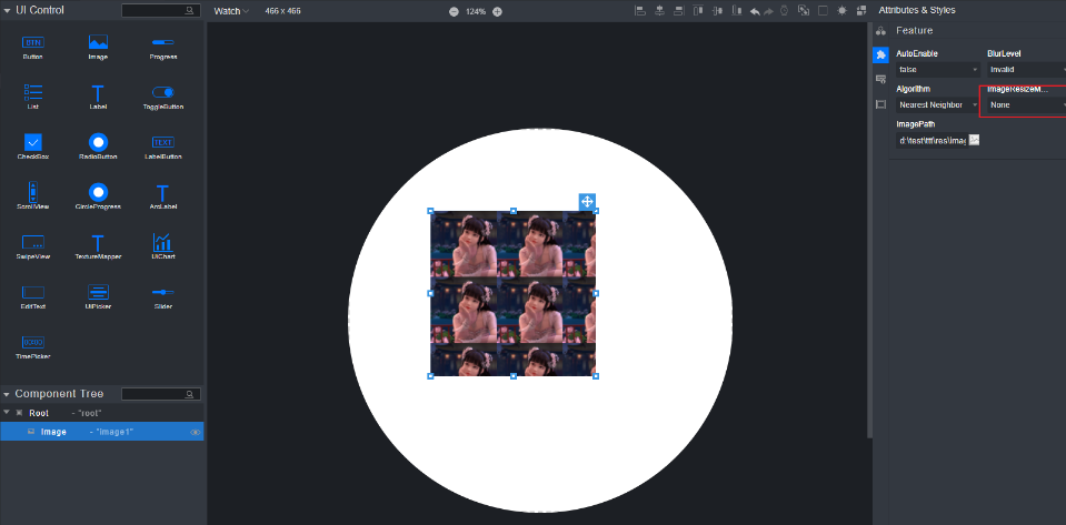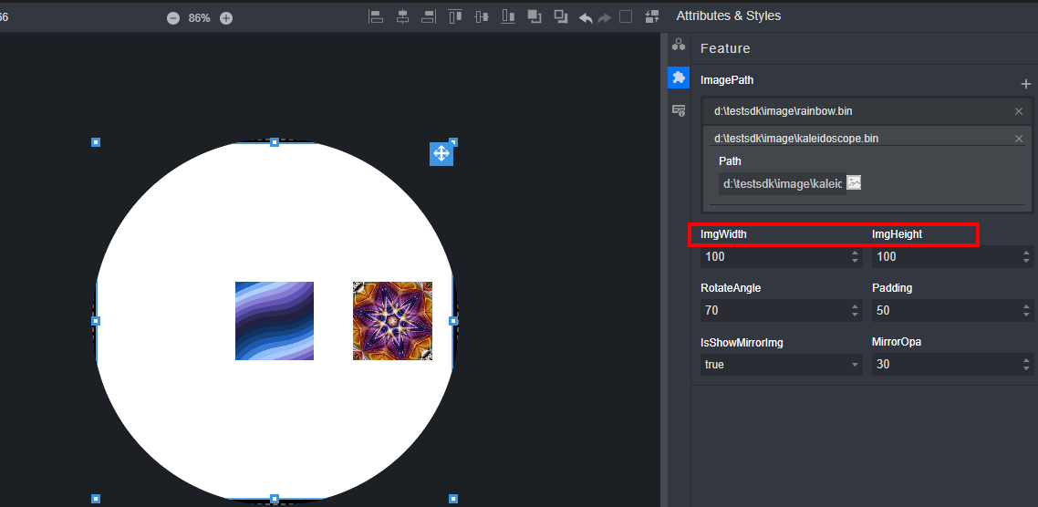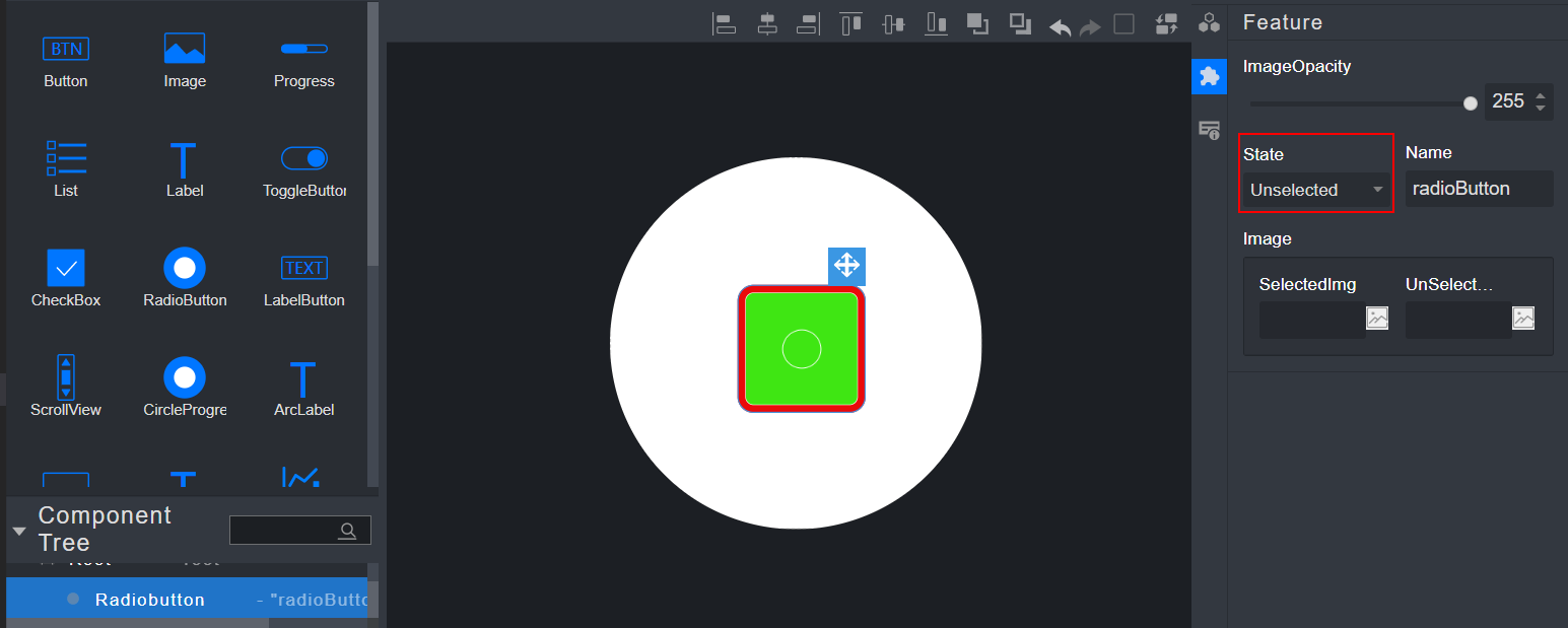 样式图标(Feature),在展开的Feature栏中修改RadioButton组件的SelectedImg属性添加选中时的图片和UnSelectedImg属性添加未选中时的图片,两张图片必须同时存在才会产生渲染效果,通过将SelectedImg和UnSelectedImg属性恢复成空(手动删除),可以实现图片的删除。