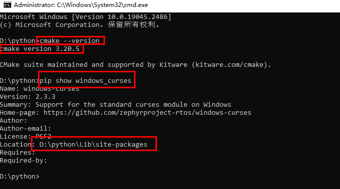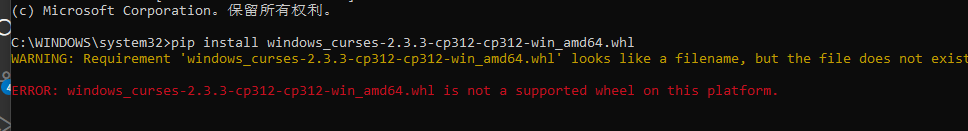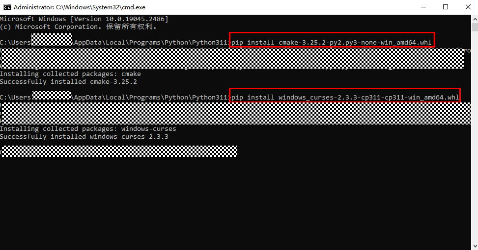 下载完成后,在文件所在目录(建议存放在python3.11.4的安装目录)打开命令提示符(cmd),执行命令“pip install 对应的whl文件”,以cmake和windows_curses举例: