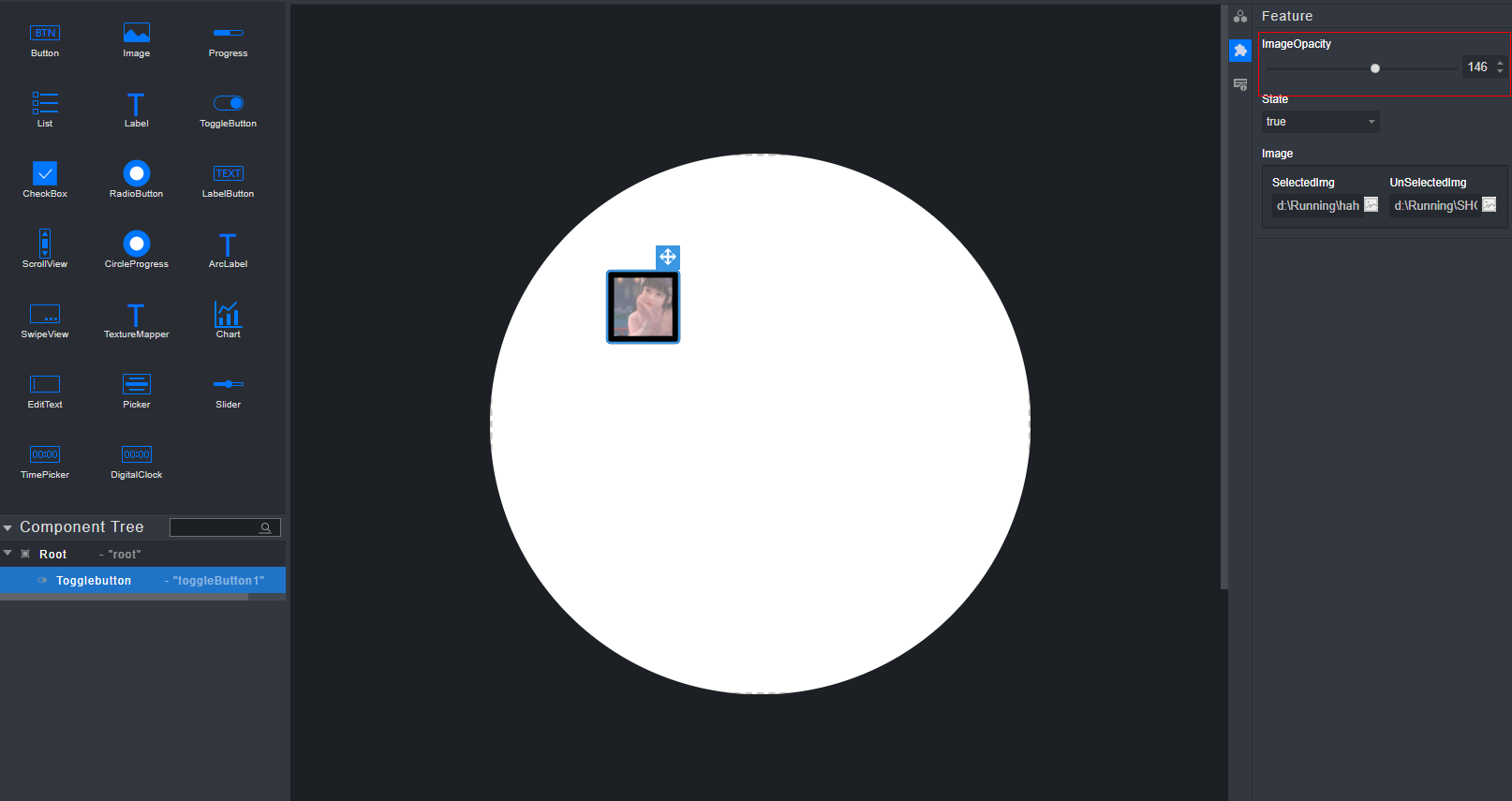 样式图标(Feature),在展开的Feature栏中修改ToggleButton组件的ImageOpacity属性修改图片透明度。