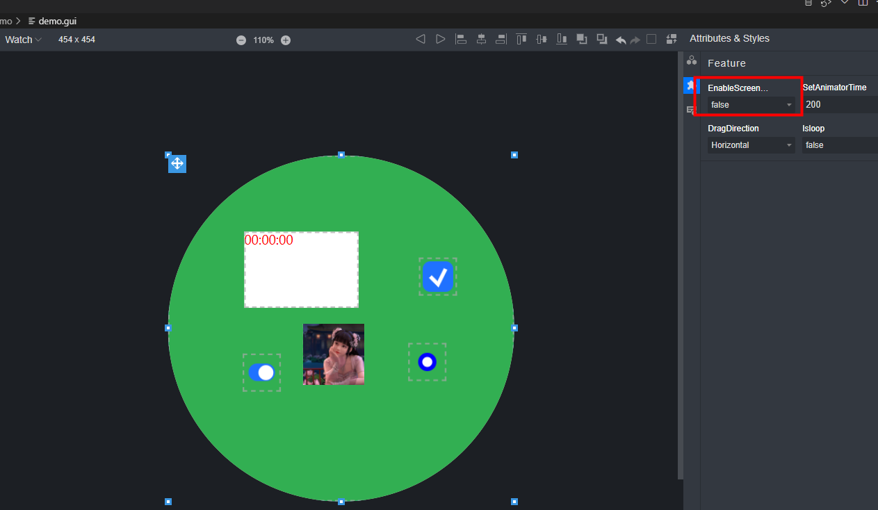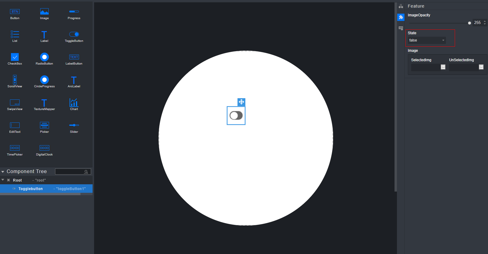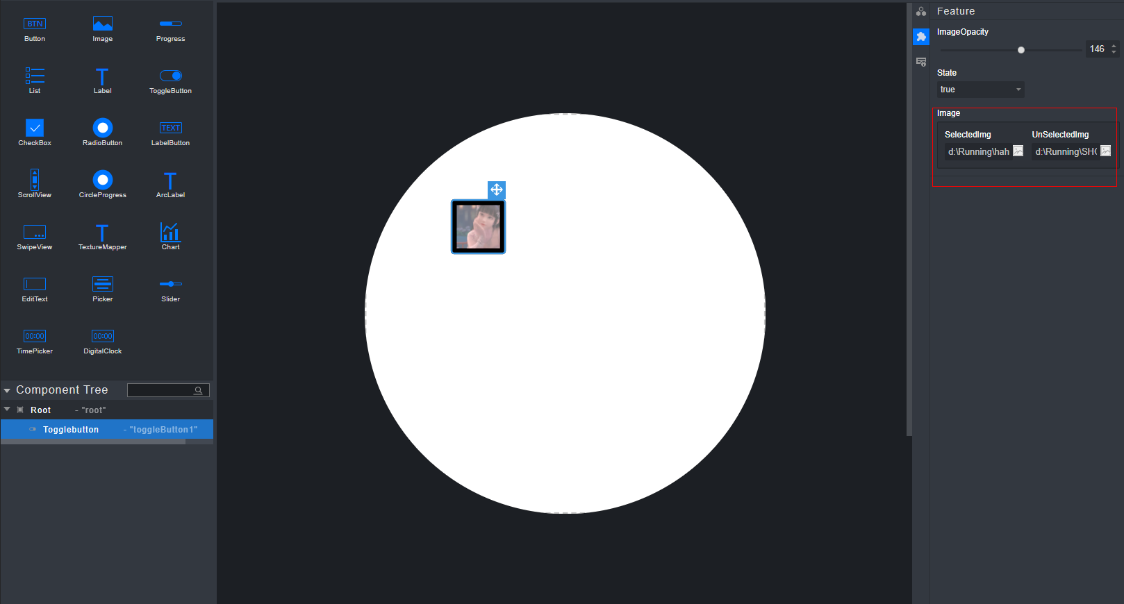 样式图标(Feature),在展开的Feature栏中修改ToggleButton组件的UnSelectedImg属性添加未选中时的图片和SelectedImg属性添加选中时的图片,两张图片必须同时存在时才会产生渲染效果,通过将属性UnSelectedImg和SelectedImg恢复成空(手动删除),可以实现图片的删除。