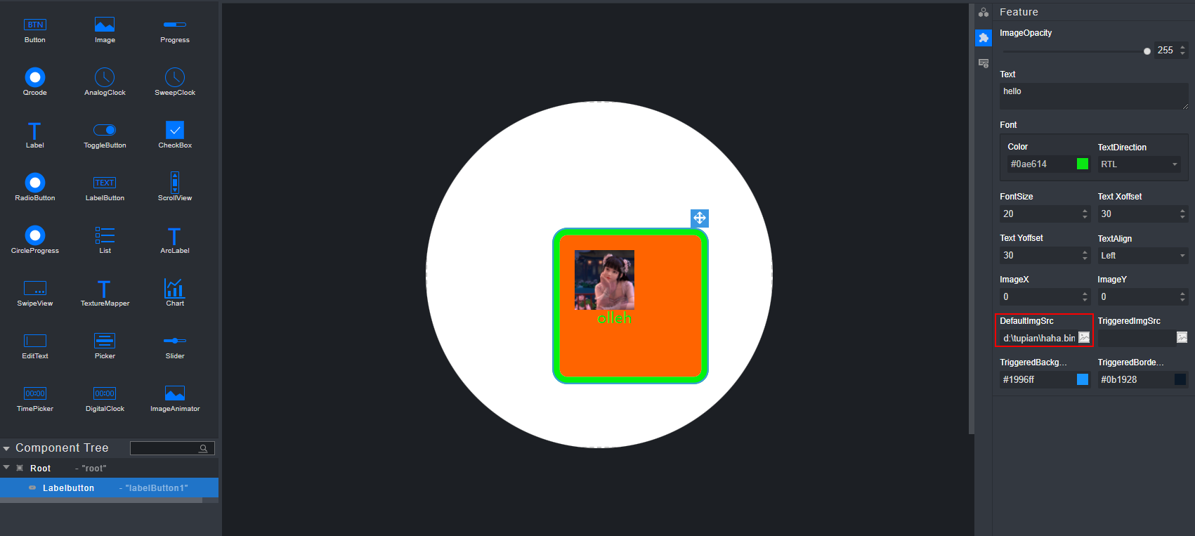 样式图标(Feature),在展开的Feature栏中修改LabelButton组件的DefaultImgSrc属性可以添加图片,通过将属性DefaultImgSrc恢复成空(手动删除),可以实现图片的删除。