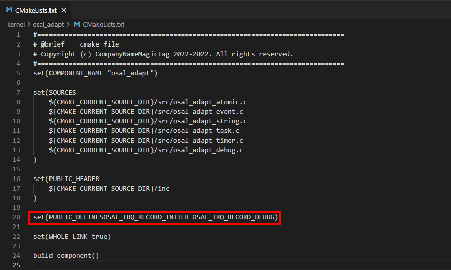 要打开锁中断维测,需要在sdk根目录的“kernel/osal_adapter/CMakeLists.txt”文件的图示位置添加“set(PUBLIC_DEFINESOSAL_IRQ_RECORD_INTTER OSAL_IRQ_RECORD_DEBUG) ”, 注意:需要rebuild。