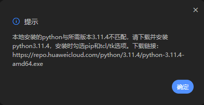 或者提示内容为“本地没有安装python”或者“本地安装的python不可用”这种错误,原因为本地没有安装python或者安装的python版本不为3.11.4,为不影响编译或者系统配置功能的正常使用,建议参考2.4章中的配置python环境下载python3.11.4的安装包并手动安装,安装过程中勾选“pip”和“tcl/tk选项”。