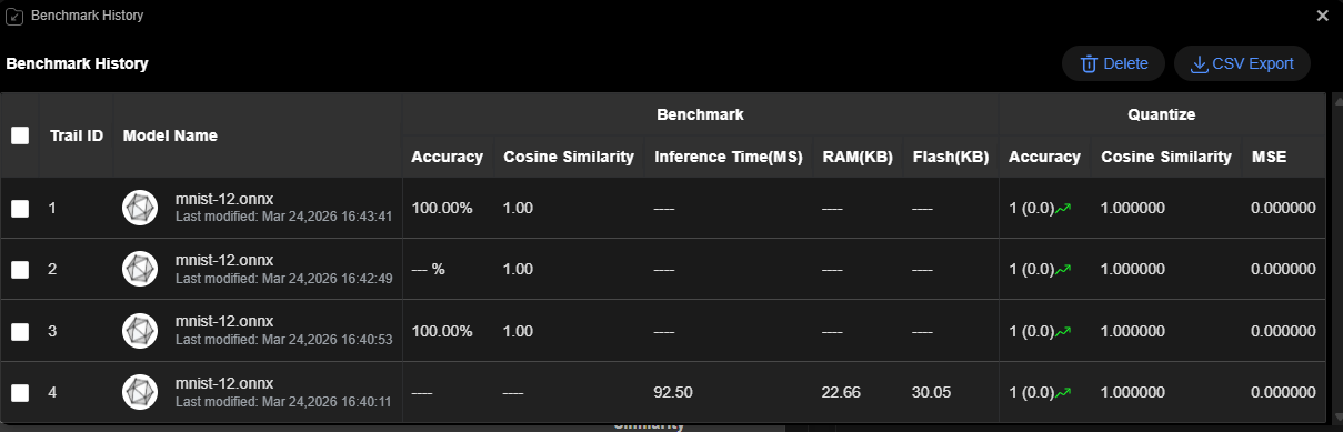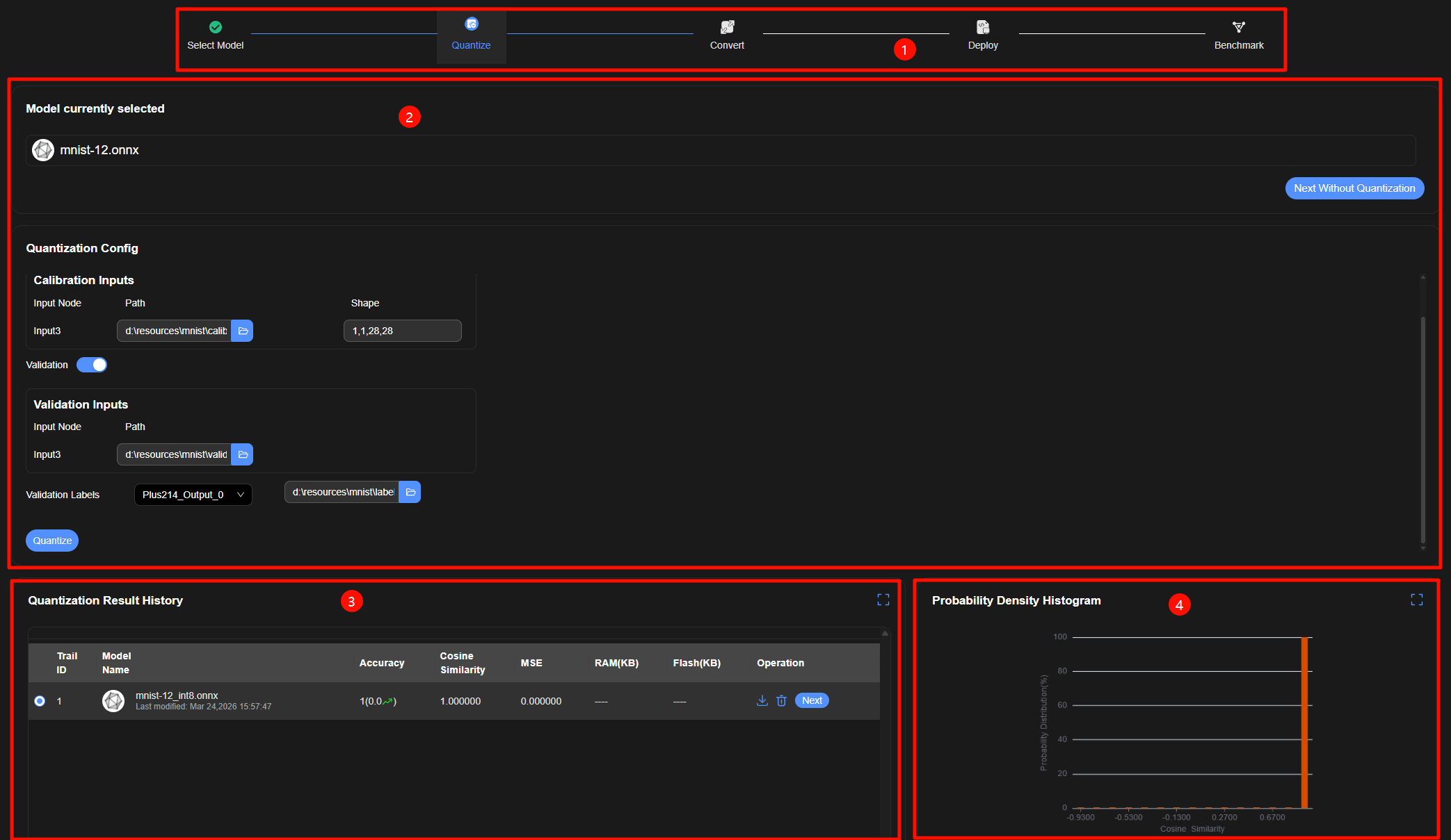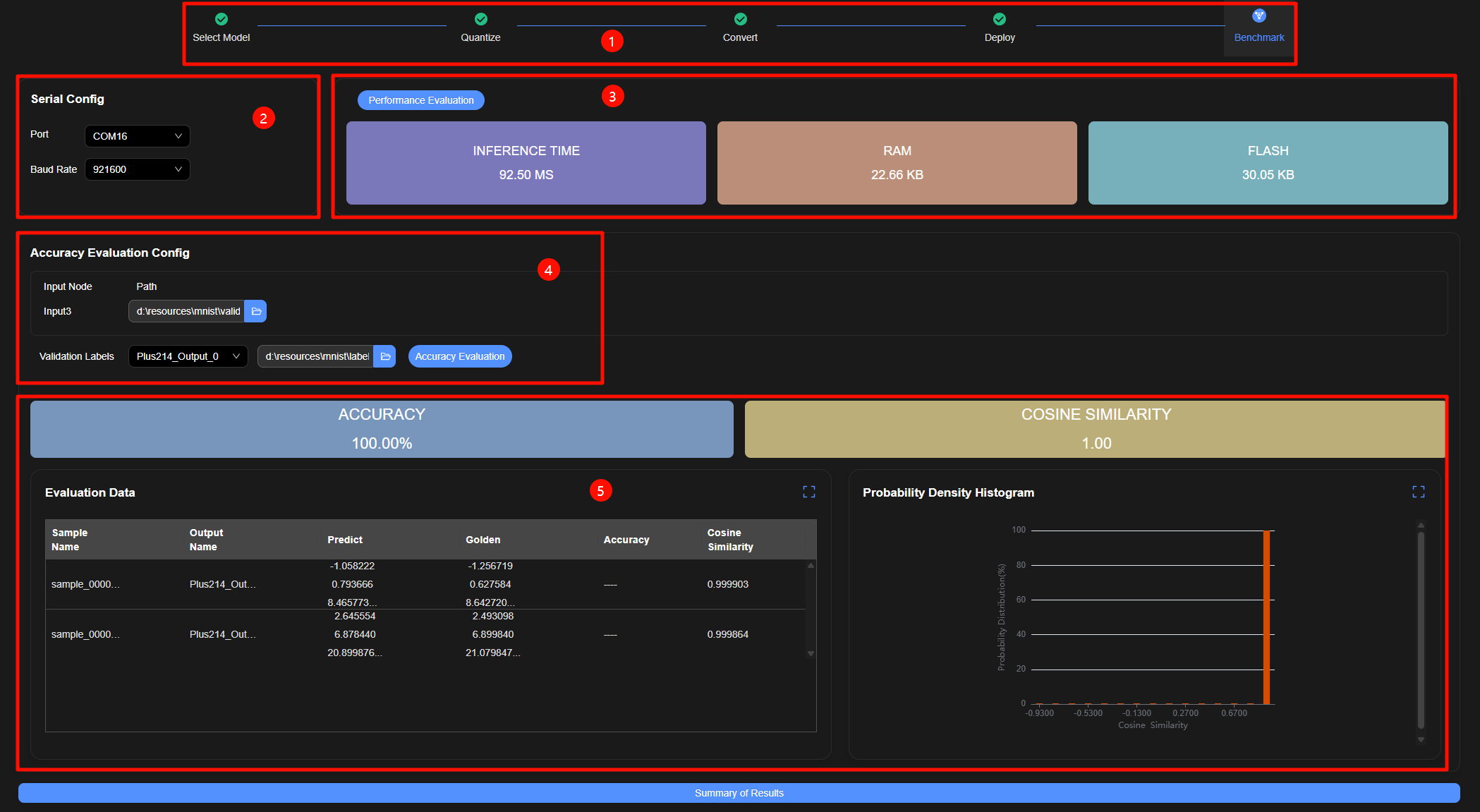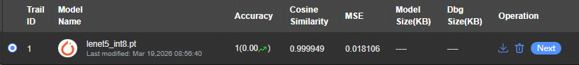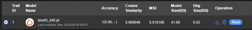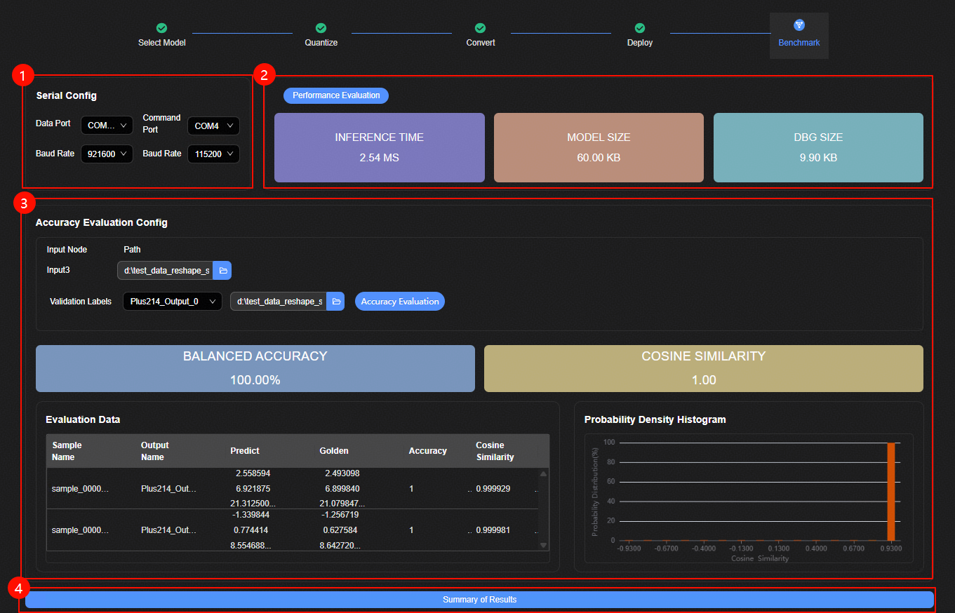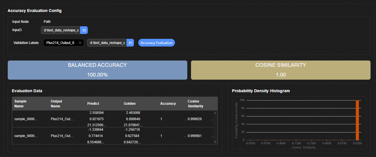 可选。配置精度验证数据集路径,单击“Accuracy Validation”按钮,执行上板精度评估。查看精度评估结果。