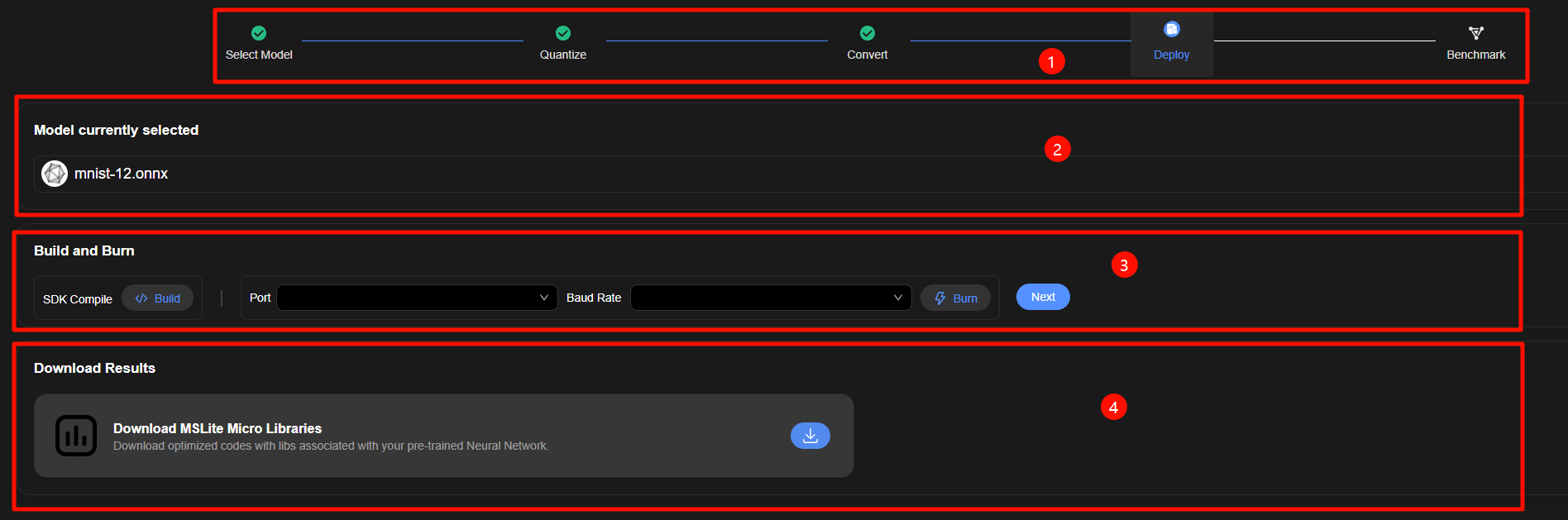 编译用户AI应用,烧录到嵌入式设备进行部署。