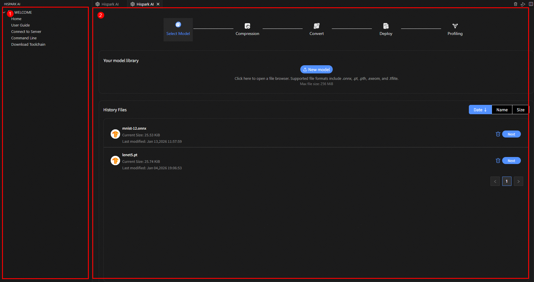 Home(主页):单击进入新建/导入工程,或在已打开工程的情况下进入HiSpark Studio AI模型选择主界面。