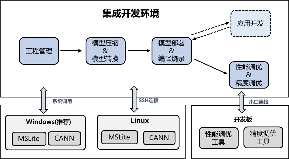 统一的IDE界面和API接口,支持CPU/NPU等芯片AI应用开发和部署。