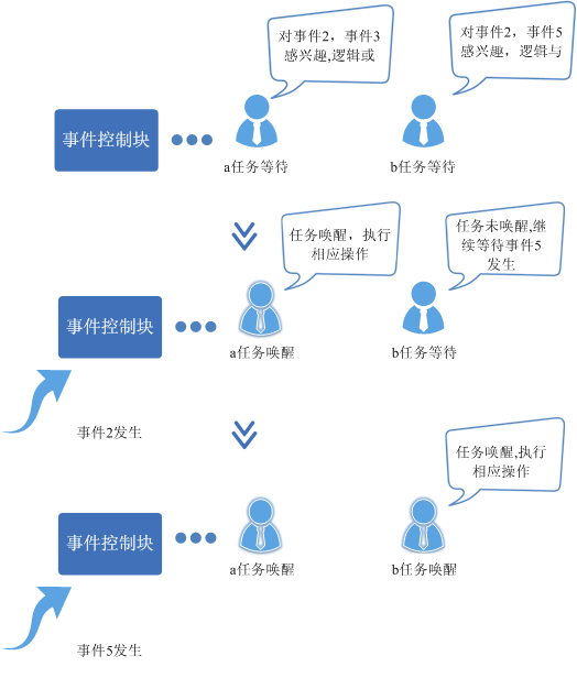 提供消息队列、事件、信号量和互斥锁功能。