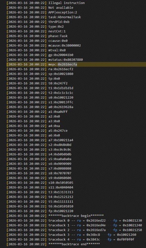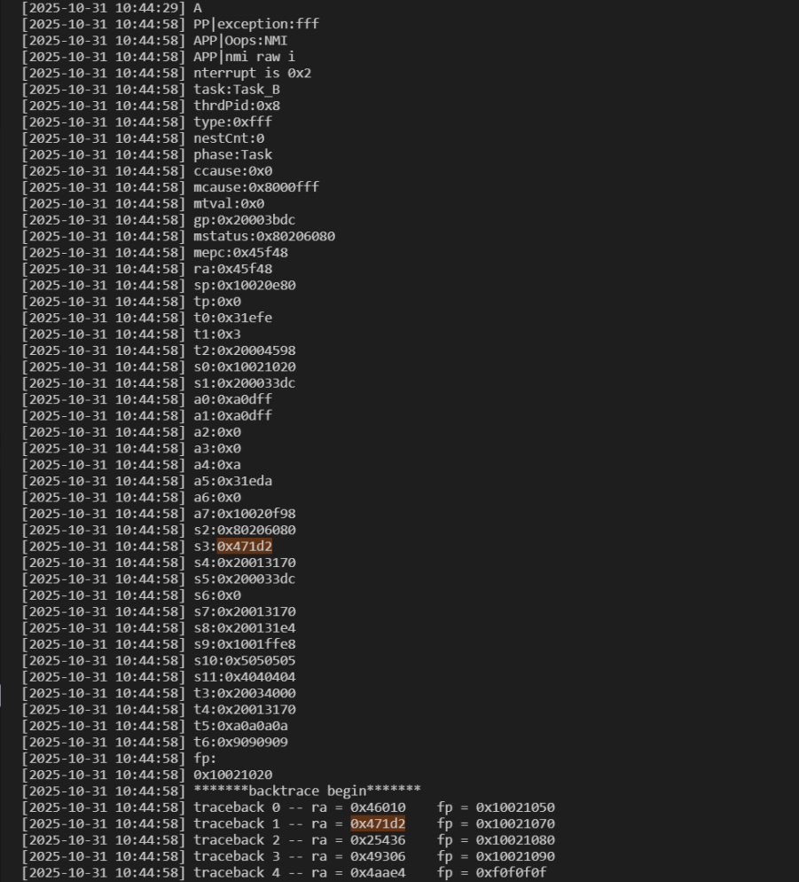 异常管理:系统运行过程中发生异常后,跳转至异常处理模块,打印当前异常的函数调用栈信息或保存当前系统状态。