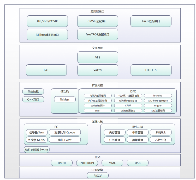 LiteOS的基础内核包括不可裁剪的极小内核和可裁剪的其他模块。极小内核只包含任务管理和调度相关的基本功能。可裁剪的模块包括信号量、互斥锁、队列管理、事件管理、软件定时器、内存管理、中断管理、异常管理和系统时钟Tick。