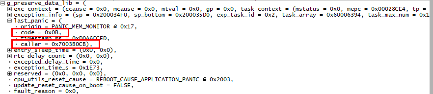 解析dump文件可知当前PC所指的位置为panic_deal,死机原因原因在g_preserve_data_lib中,死机原因code = 0x0B。