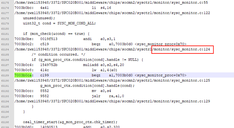 基于caller反查反汇编文件可知异常上下文为sysc_monitor.c的124行。