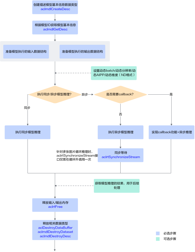 调用acl接口,可开发包含模型推理等功能的应用,这些功能可以独立存在,也可以组合存在。下图给出了使用acl接口开发AI应用的整体接口调用流程。