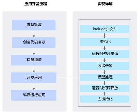 说明: 在应用开发过程中,各环节都涉及内存的申请与释放、数据传输(通过内存复制实现)、数据类型的创建与销毁,因此未在图中一一标识,关于内存申请与释放、内存复制的接口请参见内存管理,数据类型的创建与销毁的接口请参见数据类型及其操作接口。