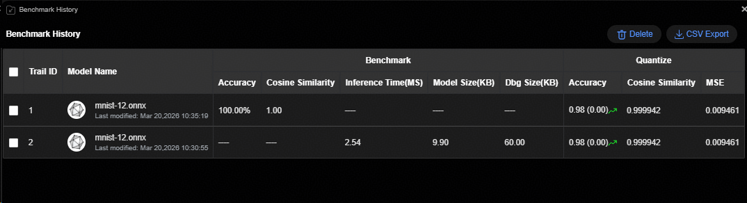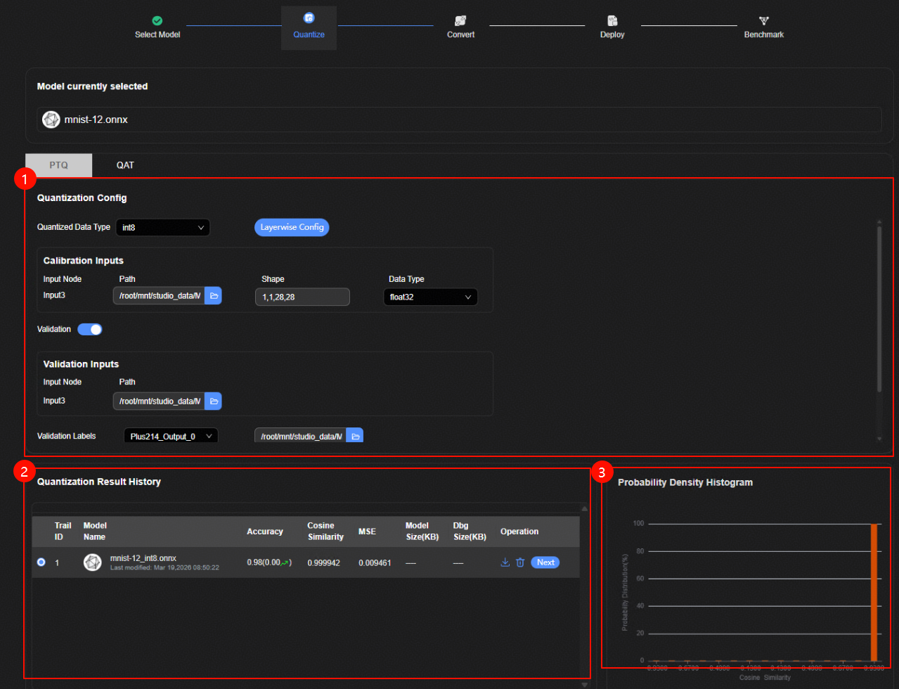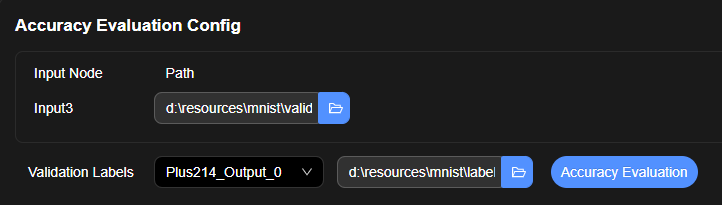 可选。配置精度验证数据集路径,单击“Accuracy Validation”按钮,执行上板精度评估。查看精度评估结果。
