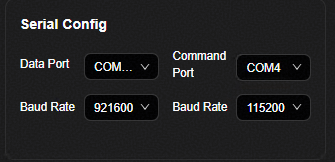 串口配置界面。在该界面配置数据传输、烧录、命令串口和波特率。