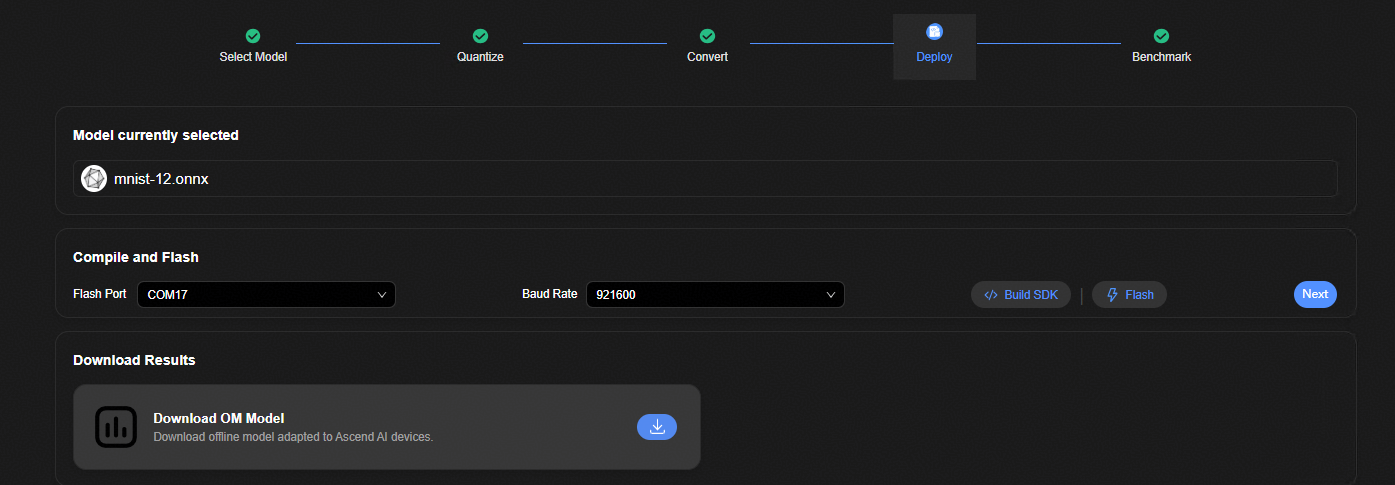编译用户AI应用,烧录到嵌入式设备进行部署。