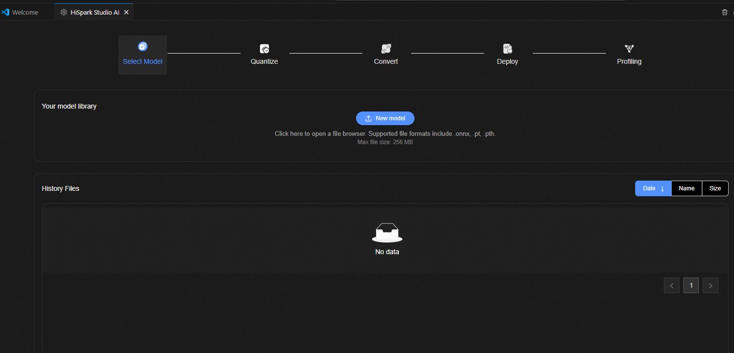 Home(主页):单击进入新建/导入工程,或在已打开工程的情况下进入HiSpark Studio AI模型选择主界面。