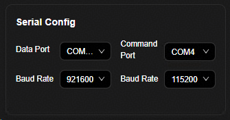 在“Serial Config”窗口配置数据传输和命令发送的端口、波特率。