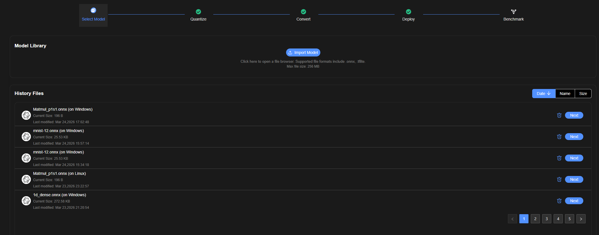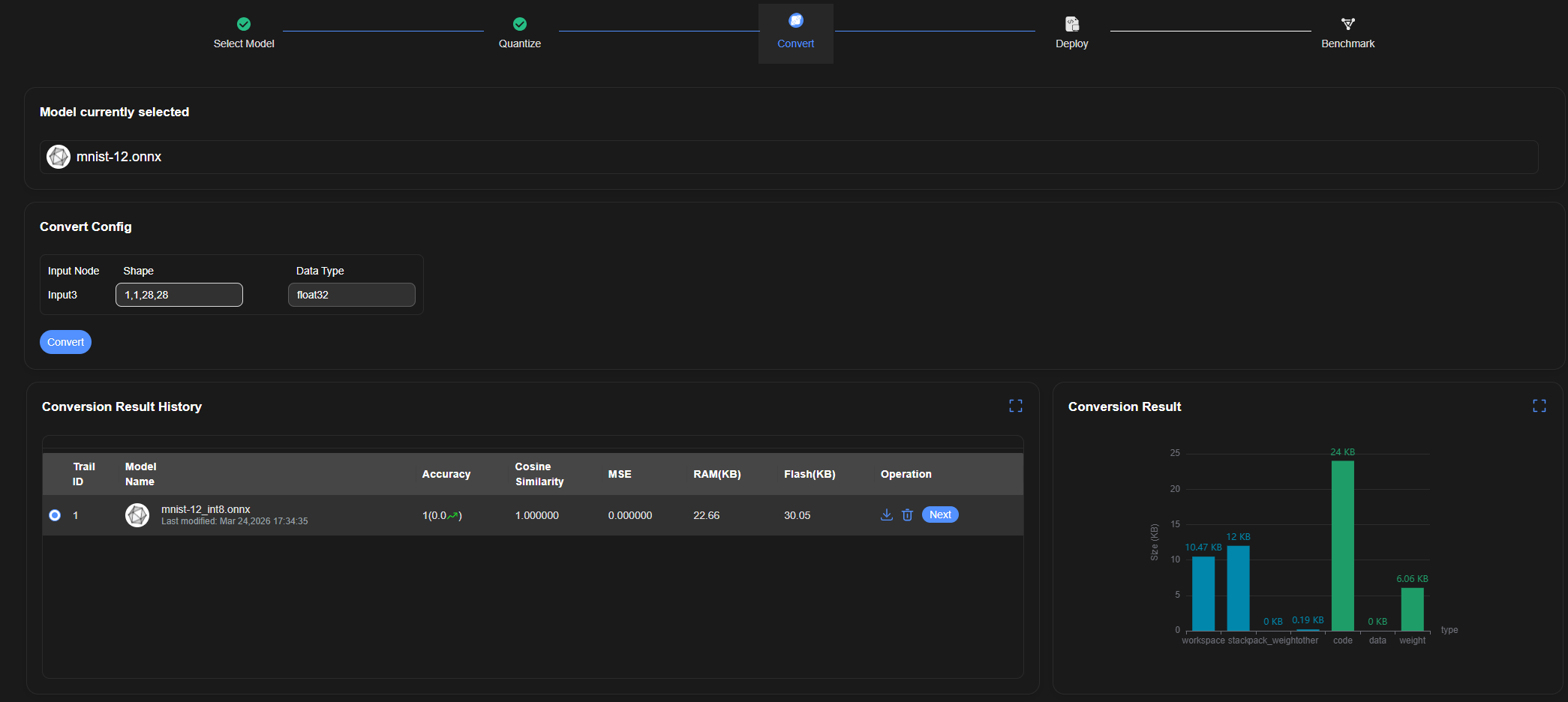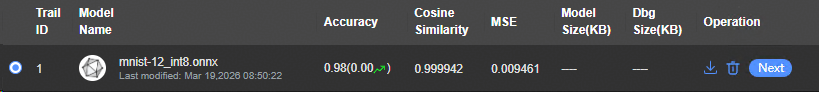 在“Quantization Result History ”的“Operation”列单击“Next”按钮,进入模型转换页面。