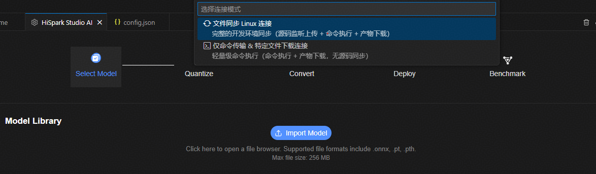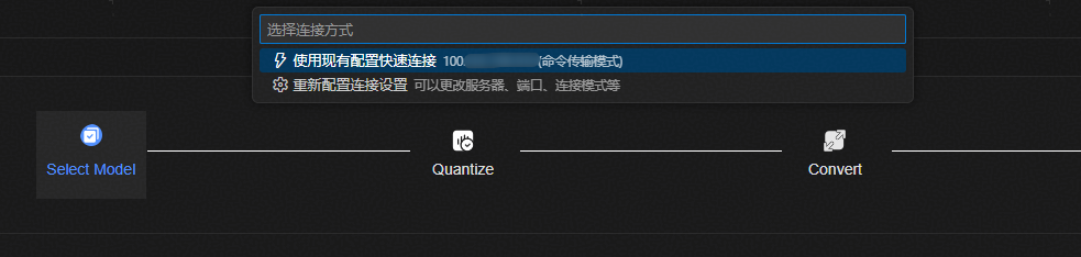 首次连接请根据提示设置远端连接。注意端口选择映射到容器内的服务器端口。导入模型后,自动跳转到量化页面。