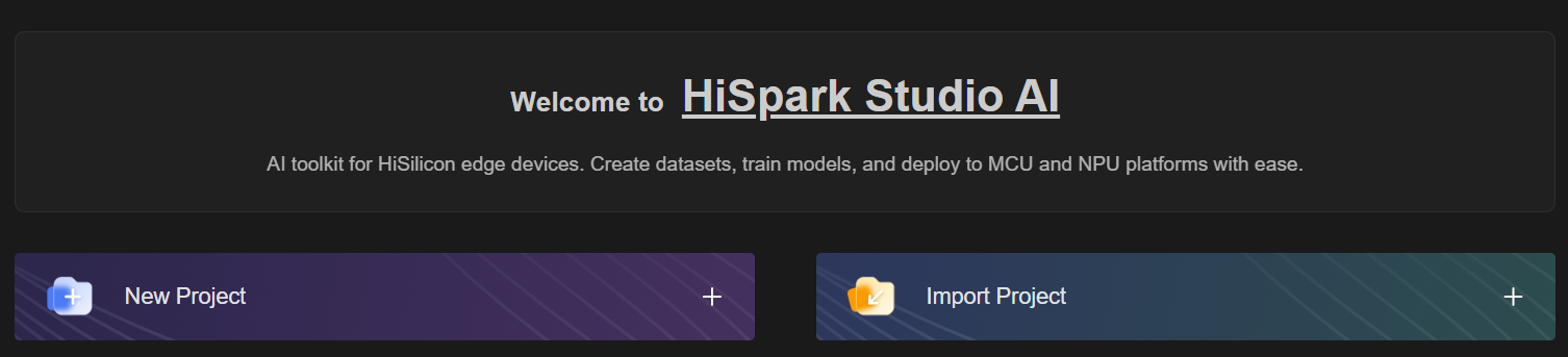 进入HiSpark Studio AI插件单击“Home”按钮,单击“Import Project”按钮进入新建工程页面。在弹出框中选择SOC类型为“3322”;选择已经下载的SDK路径;并为工程设置好名字和工程文件保存地址。