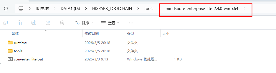 将mindspore-lite Windows侧工具包放置于工具链安装目录中的tools目录下。名字需严格为“mindspore-enterprise-lite-2.4.0-win-x64”,如下所示: