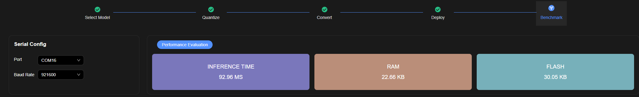 单击“性能验证”按钮,完成模型上板性能验证。验证完成后,在性能验证窗口显示推理时间、和模型大小。