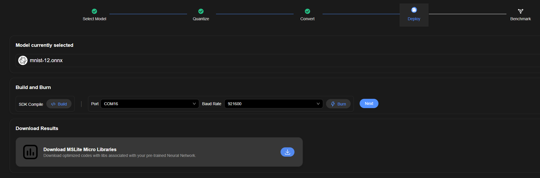 在“Conversion Result History ”的“Operation”列单击“Next”按钮,进入模型部署页面。