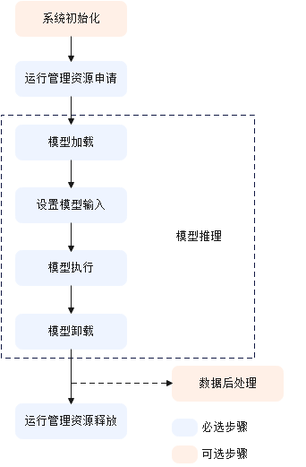 在接口调用流程图中展示了应用开发中的典型功能抽象出主要接口的调用流程。例如,若需要实现模型推理功能,则需先加载模型,模型推理结束后,则需卸载模型;若模型推理后需打印sample推理的结果概率,则需进行数据后处理。