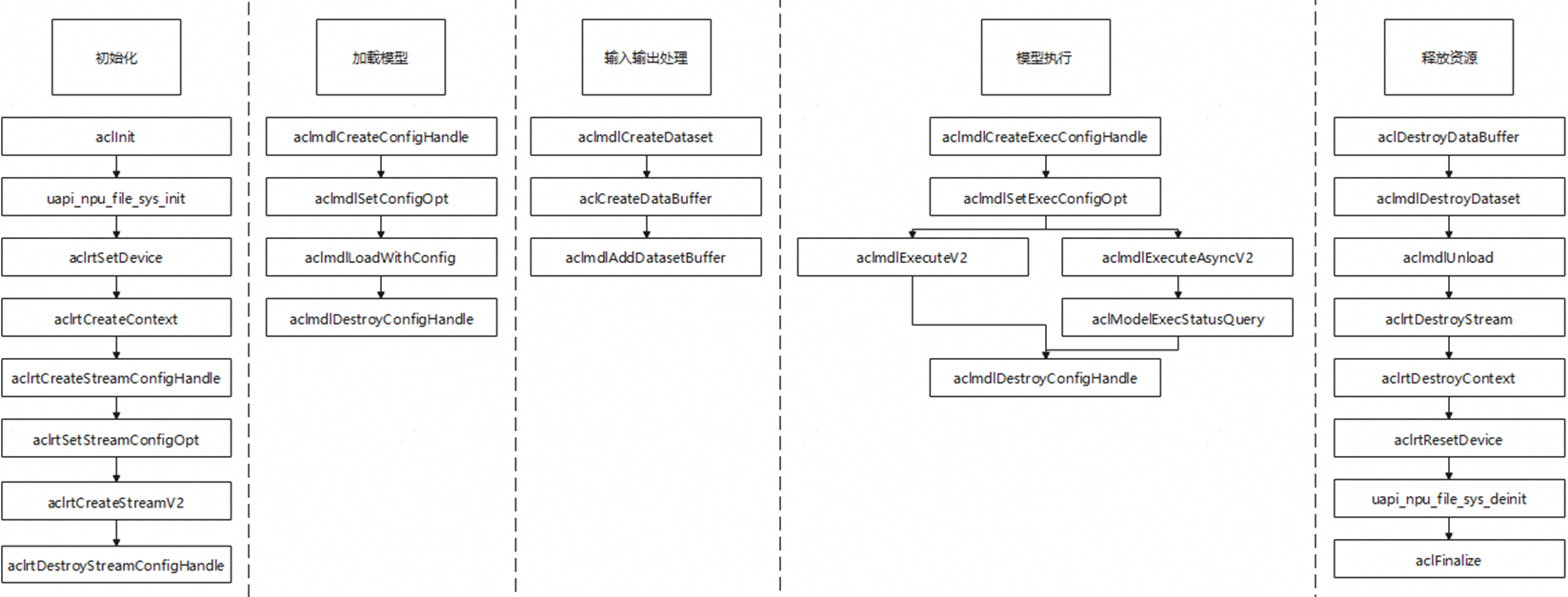 对于一次完整的模型推理,需要调用多个acl接口进行实现,为方便用户快速上手开发,现提供sample供用户学习。详细示例可参考“SDK application/samples/ai_samples”以及“SDK application/3322/3322_ai_engine/ai_sample”。