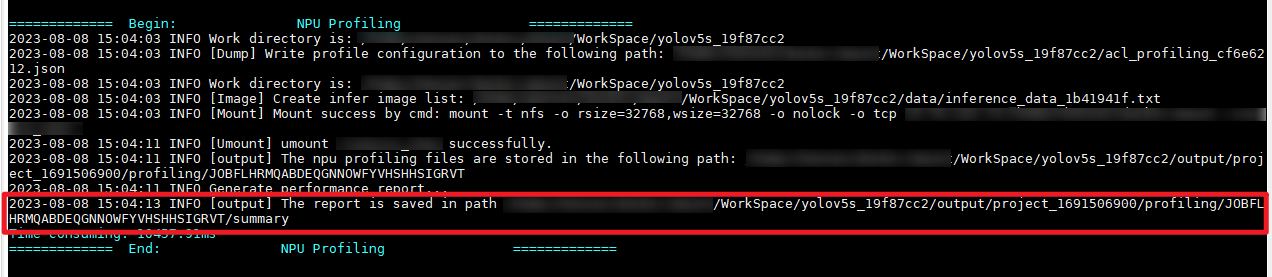 执行Oneclick后,MindCmd会将采集到的性能数据保存在csv表格中(如图1所示),csv表格存放位置如图2所示,模型的整网性能数据打印如图3所示。