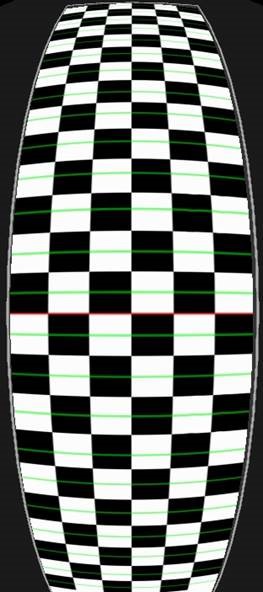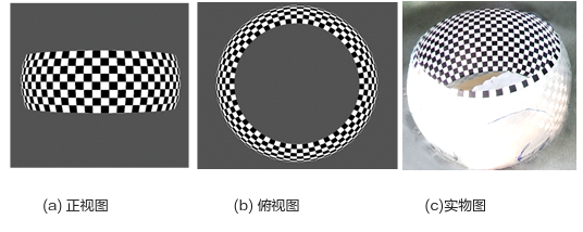 建议每个格子为5°,故环球形一周仍然是72个格子,垂直方向(纬度方向)格子数量根据重叠区大小设计即可,比如镜头FOV为200°,则有40°重叠区,此时垂直方向需要8个格子以上,上下预留1个格子,10个格子较为合适。此时棋盘格则覆盖南纬25°至北纬25°之间的区域。效果如图1所示,其中实物图中垂直方向共有16个格子,覆盖80°重叠区,是为了适应不同的镜头选型,客户可根据自身的产品形态进行调整。